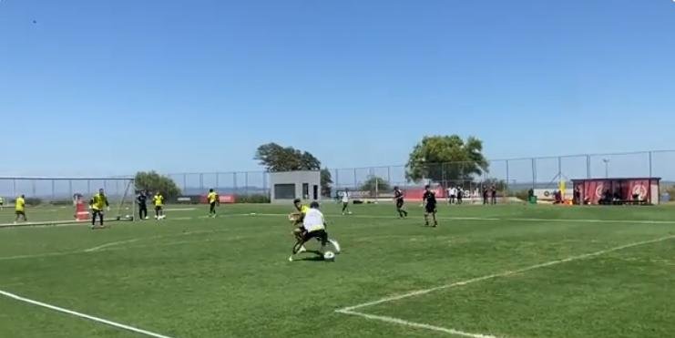 Mais tarde, já mais aquecidos, os atletas foram colocados para aprimorar as jogadas individuais combinadas com conclusões em espaço curto. Gustavo Maia protagonizou um bonito lance durante a atividade de hoje.