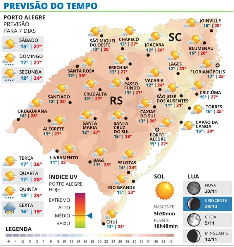 Em Porto Alegre, a mínima prevista é de 15°C e a máxima de 25°C. Aquece mais no Noroeste do Estado, onde não se afasta chuva isolada no final do sábado.