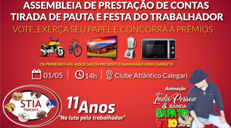 No próximo domingo, 01/05 acontece mais uma edição da Assembleia de Tirada de Pauta, Prestação de Contas e Festa do Trabalhador, promovida pelo Sindicato dos Trabalhadores nas Indústrias da Alimentação de Tapejara e região. O evento ocorre no Clube Atlântico de Linha Calegari, a partir das 14 horas.