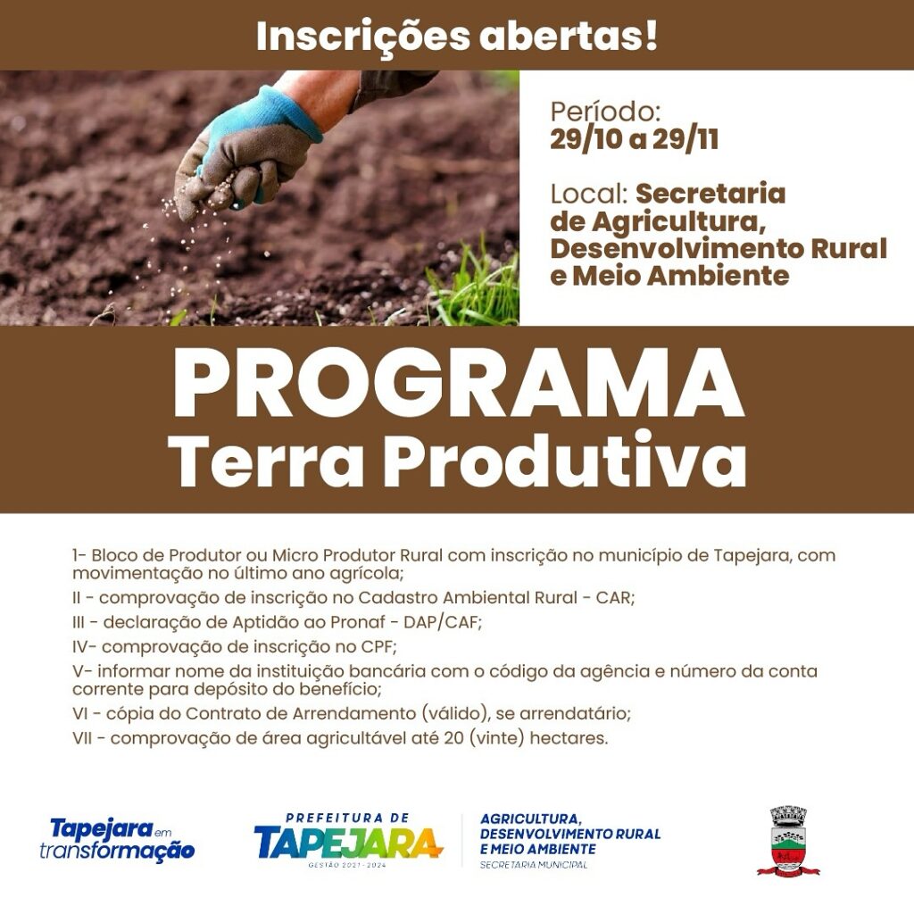 Participe do Programa Terra Produtiva e invista na sua terra. Inscrições de 29/10 a 29/11, na Secretaria de Agricultura!