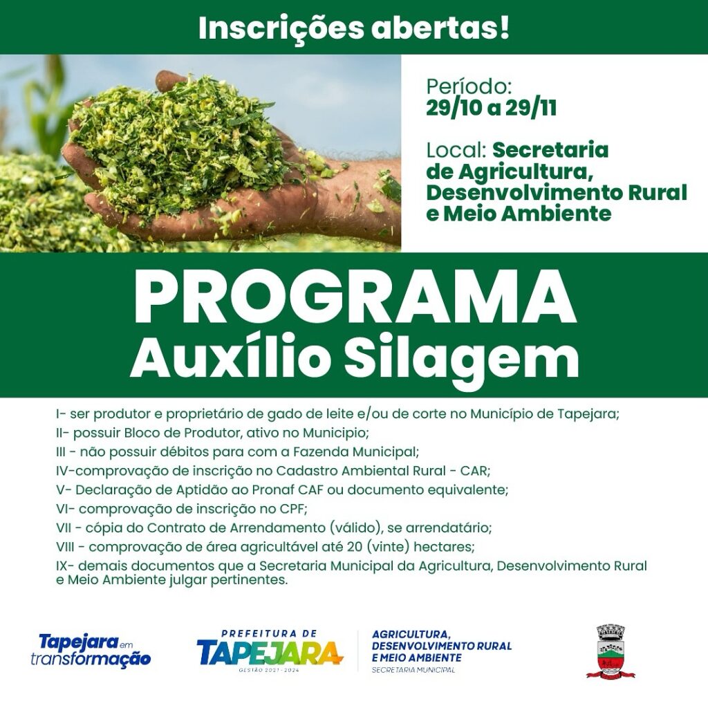 Inscreva-se no Programa Auxílio Silagem e fortalecimento da produção rural de Tapejara. De 29/10 a 29/11, na Secretaria de Agricultura!