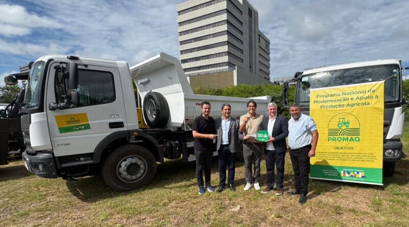 Na segunda-feira (6), o prefeito Evanir Wolff (Big) e o secretário de Desenvolvimento Rural, Agricultura e Meio Ambiente, Eduardo Bortoloto (Tilico), estiveram em Porto Alegre para o ato de entrega de um caminhão destinado ao município. O equipamento foi viabilizado por meio de emenda parlamentar junto ao Ministério da Agricultura e Pecuária, no âmbito do Programa Nacional de Modernização e Apoio à Produção Agrícola (Promaq). A agenda contou com a presença do assessor parlamentar Marcelo Arruda e do deputado federal Danrlei de Deus, responsável pela destinação do recurso.