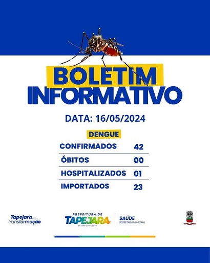 Tapejara: Boletim da Dengue 16/05/2024 admin2 2 anos atrás A Secretaria Municipal da Saúde de Tapejara divulga o Boletim da Dengue do dia 16/05/2024. Casos confirmados: 42 Óbitos: 00 Internados: 01 Importados: 23 Compartilhe isso: