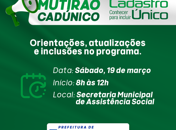 O Governo de Tapejara, através da Secretaria de Assistência Social, comunica a população tapejarense que estará promovendo um mutirão de orientações, atualizações e inclusões do Cadastro Único. O evento acontece no sábado (19), das 08h às 12h, na Secretaria Municipal de Assistência Social, localizada na Rua Osório da Silveira, ao lado do Centro Administrativo Padre Raimundo Damin.