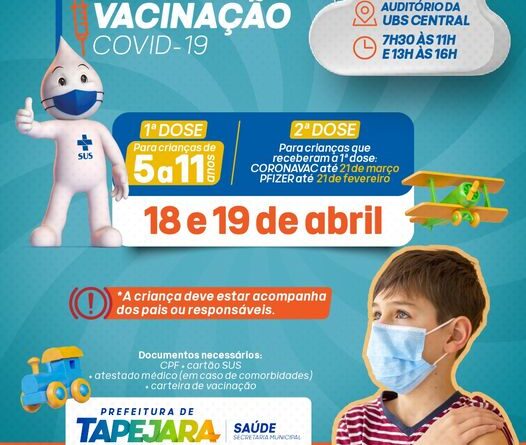 A Secretaria de Saúde de Tapejara promove nesta segunda-feira (18) e na terça-feira (19), a primeira etapa da vacinação infantil contra a Covid-19 em crianças com idades entre 05 e 11 anos. Também, haverá aplicação da segunda dose em crianças de 05 a 11 anos, vacinadas com a primeira dose de CoronaVac até 21 de março e, para crianças de 05 a 11 anos, vacinadas com a primeira dose de Pfizer até 21 de fevereiro. A etapa acontece no auditório da UBS Central, das 7h30 às 11h e das 13h às 16h.