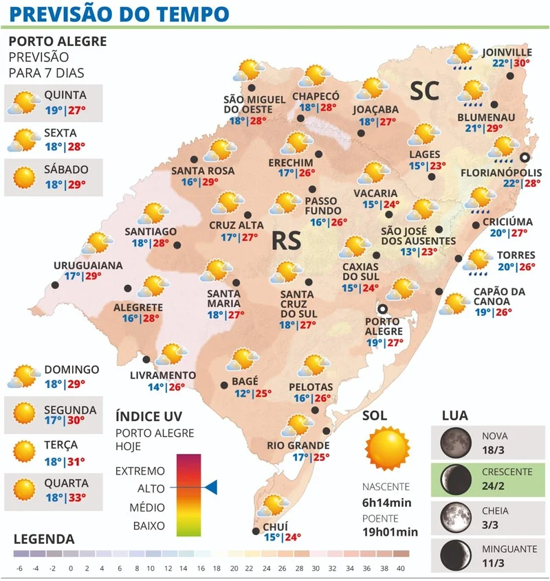 O ar mais ameno proporciona um início de dia com temperaturas mínimas mais baixas, inferiores a 20ºC em quase todo o estado, e faz até um pouco de frio no período da manhã em pontos da Campanha e da Serra do Sudeste. A tarde será bastante agradável com máximas predominantemente inferiores a 30ºC.