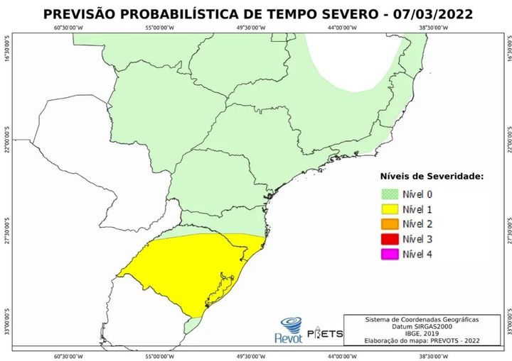 TEMPO SEVERO – De acordo com a previsão probabilística de tempo severo emitida pela PREVOTS, o nível 1 está previsto para o RS e sudeste de SC. A área inclui Porto Alegre/RS, Santa Maria/RS, São Borja/RS, Santa Cruz do Sul/RS, Ijuí/RS, Uruguaiana/RS, Alegrete/RS, São Gabriel/RS, Pelotas/RS, Rio Grande/RS, Bagé/RS, Caxias do Sul/RS, Passo Fundo/RS, Lages/SC, Criciúma/SC e cidades próximas. Na discussão proposta pela PREVOTS, “uma intensa frente fria vai se mover para norte até o centro-sul do RS ao longo do período conforme um intenso ciclone extratropical se intensifica no Atlântico na latitude da província de Buenos Aires. Conforme a frente se move para norte pelo Uruguai à tarde, convecção deve se formar na dianteira da frente e avançar para norte pelo RS. Haverá intenso escoamento confluente em baixos níveis no setor quente. Essa atividade deve atingir o centro-sul do RS à tarde e o norte do RS e sudeste de SC à noite. É possível que uma linha de instabilidade se orgeniza a partir dessa convecção, favorecendo a ocorrência de rajadas de vento severas. Nas demais áreas do centro-sul do Brasil, tempestades isoladas devem ocorrer à tarde.