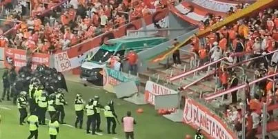 Após o apito final e a eliminação do Inter na Copa Sul-Americana, alguns torcedores colorados tentaram invadir o campo do Beira-Rio para protestar e agredir atletas.