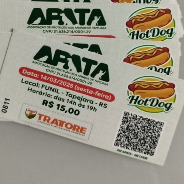 Ingressos disponíveis com os voluntários, também na Loja Avenza, pets Mimi Dog, Bichos e Cia, Center Vet, Agropecuária Frumi, Pet Agro, Farmácia Território Animal e Cell Solutions.