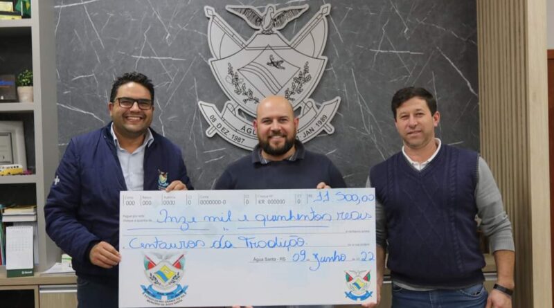 Mais uma entidade água-santense recebeu recurso da Administração Municipal. O Grupo Cultural Tradicionalista de Cavalgadas Centauros da Tradição, representado pelo patrão Luís Paulo Berton e pelo membro do Grupo, Jairo Rodigheri, esteve reunido com o prefeito municipal, Eduardo Picolotto, para a assinatura do Termo de Fomento que garante ao grupo a transferência de valor para custeio das melhorias estruturais no galpão sede do grupo e auxilio financeiro para a realização do 6º Festival da Ovelha Recheada promovido pelo grupo.
