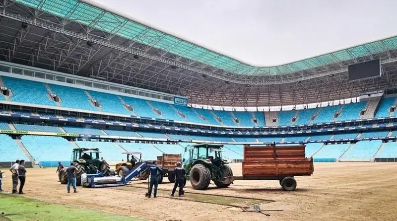 “A nova grama será instalada em rolos, ao estilo “ready to play”, proveniente de uma fazenda em Santo Antônio da Patrulha, e em seguida será semeada a grama de inverno. Com este processo, espera-se que rapidamente tenhamos um gramado em excelentes condições para jogo. A previsão é de que a troca do gramado seja concluída até o início da próxima semana, dependendo das condições climáticas em Porto Alegre”, diz o presidente da Arena, Mauro Araújo.