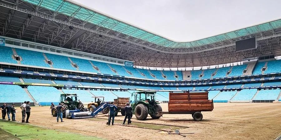 “A nova grama será instalada em rolos, ao estilo “ready to play”, proveniente de uma fazenda em Santo Antônio da Patrulha, e em seguida será semeada a grama de inverno. Com este processo, espera-se que rapidamente tenhamos um gramado em excelentes condições para jogo. A previsão é de que a troca do gramado seja concluída até o início da próxima semana, dependendo das condições climáticas em Porto Alegre”, diz o presidente da Arena, Mauro Araújo.