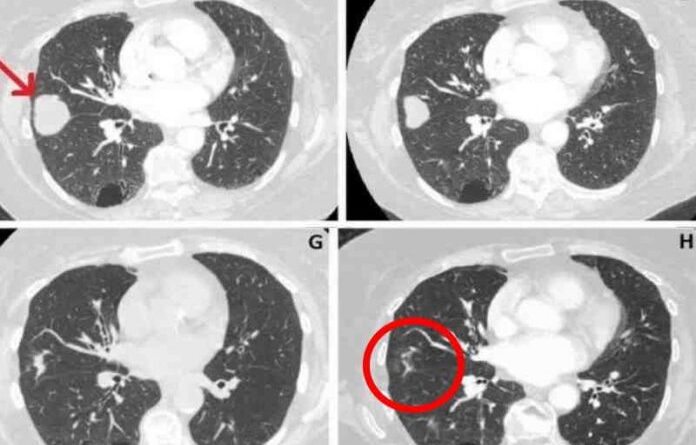 Após receber tratamento com canabidiol (CBD), o tumor no pulmão direito de uma idosa de 80 anos do Reino Unido reduziu 76%.