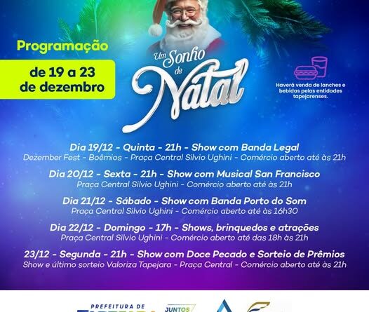A programação chamada “Um Sonho de Natal” de Tapejara trará shows na Praça Central Sílvio Ughini de 19 a 23 de dezembro.