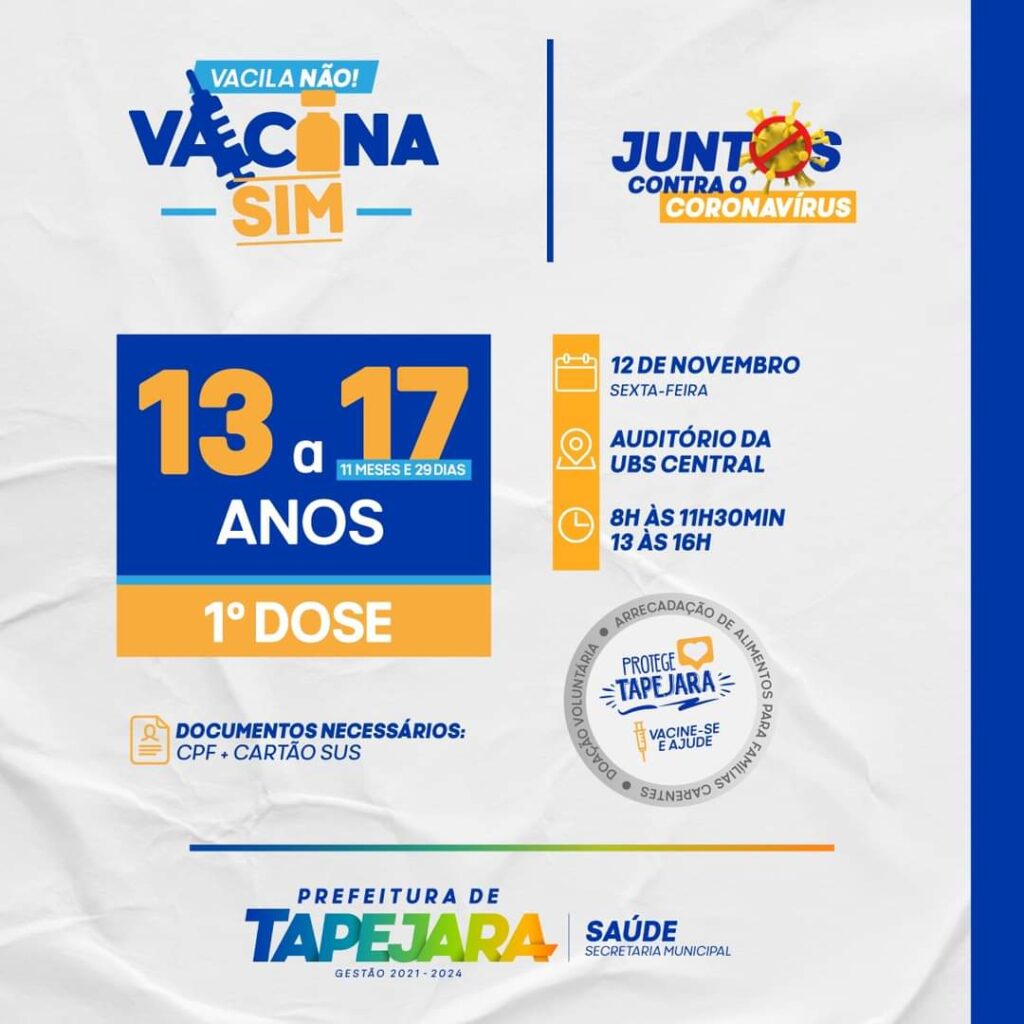A Secretaria de Saúde de Tapejara promove nesta sexta-feira, 12/11 a vacinação contra a Covid-19 (dose 1) para adolescentes de 13 anos a 17 anos, 11 meses e 29 dias.