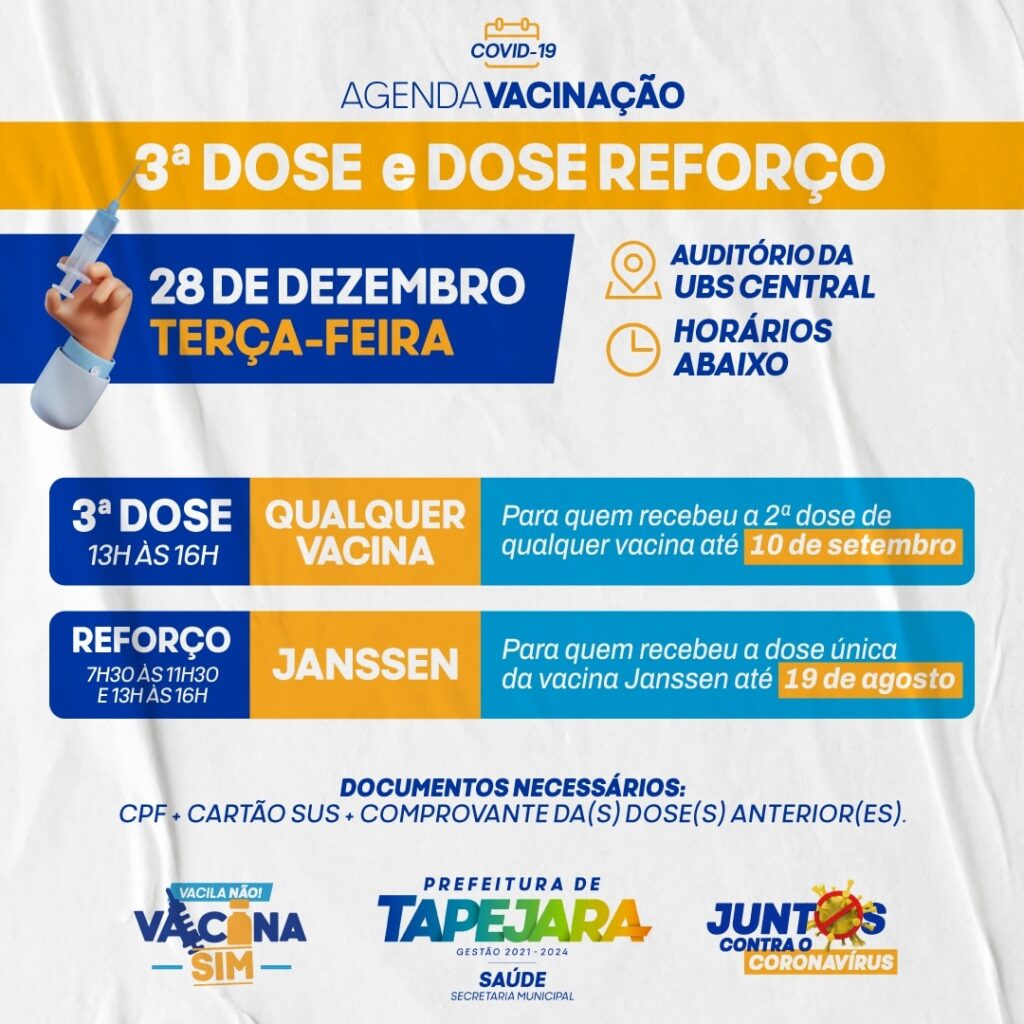 A Secretaria de Saúde de Tapejara promove nesta terça-feira (28) a vacinação da dose de reforço para pessoas que receberam a segunda dose de qualquer vacina contra a Covid-19 até o dia 10 de setembro. Também haverá reforço para pessoas vacinadas com a dose única da Janssen até 19 de agosto.