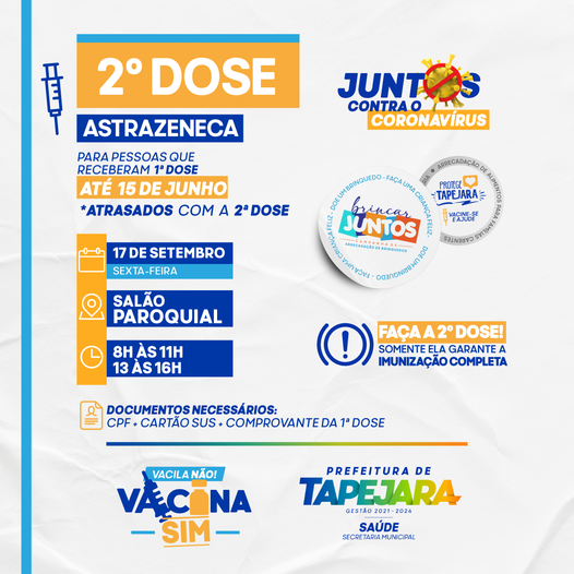 A Secretaria de Saúde de Tapejara promove nesta sexta-feira, 17/09, a vacinação da segunda dose contra a Covid-19 para pessoas que receberam a primeira dose de AstraZeneca até o dia 15 de junho (e estão em atraso com sua segunda dose). A etapa acontece no Salão Paroquial das 08h às 11h e das 13h às 16h.