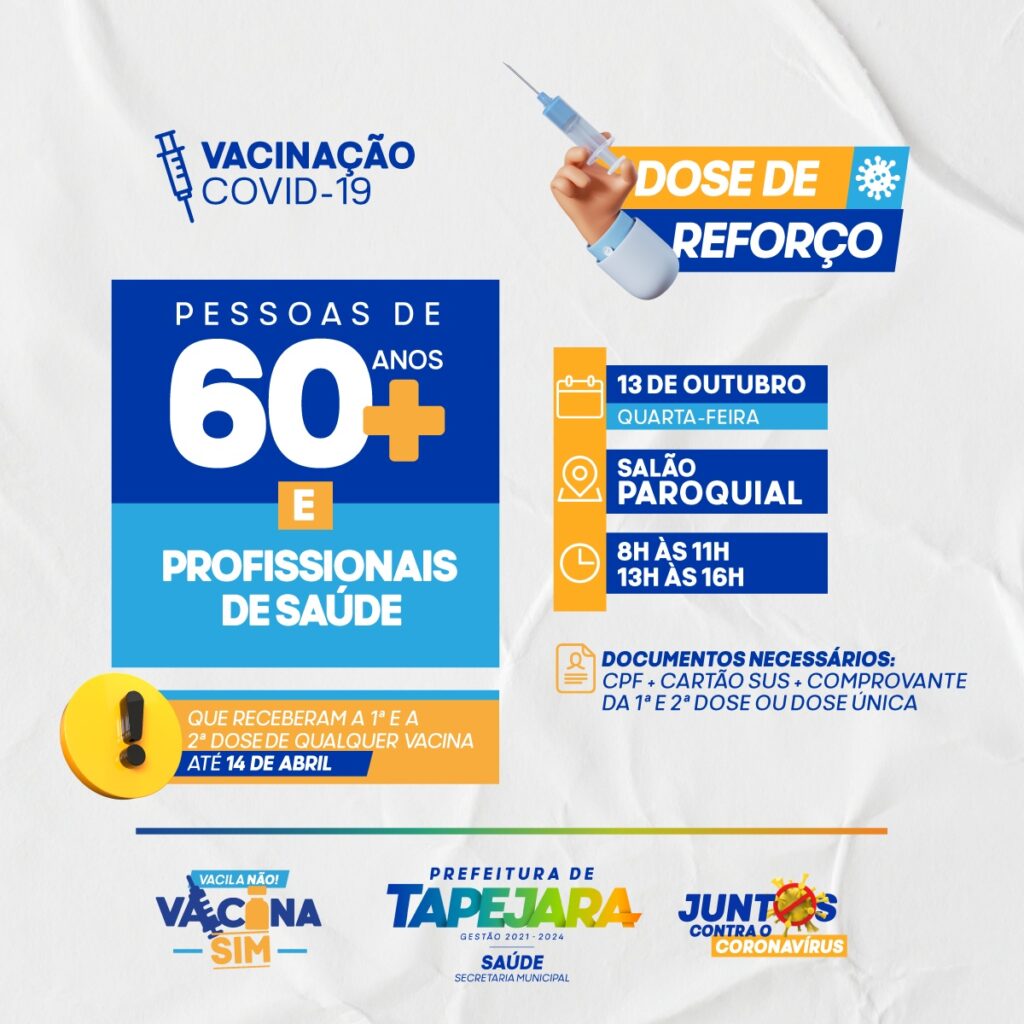 A Secretaria de Saúde de Tapejara promove nesta quarta-feira, 13/10, a vacinação da dose de reforço para profissionais de saúde e pessoas com 60 anos ou mais, que receberam o esquema vacinal completo contra a Covid-19 (com 1ª e 2ª dose ou dose única de qualquer vacina) até o dia 14 de março.