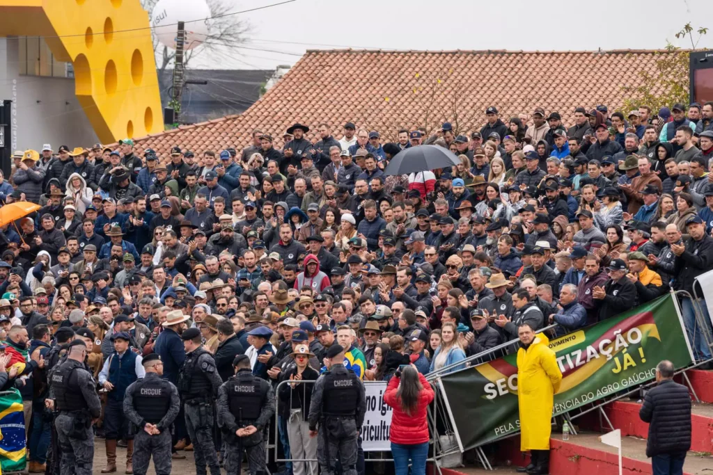 “Eu me solidarizo com as famílias que não suportaram esse momento”, destacando a lembrança dos produtores que tiraram a própria vida devido às dívidas. No entanto, ele ficou visivelmente incomodado com o protesto realizado no local. “O povo gaúcho é de respeito, e quando se perde respeito se perde a razão”, afirmou.