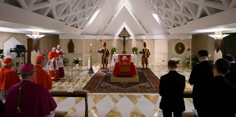 O Vaticano publicou nesta terça-feira (22) as primeiras imagens do corpo do papa Francisco no caixão, antes de reunião de cardeais sobre o funeral, que deve ter a presença de líderes mundiais como Donald Trump e Volodimir Zelensky. As fotos, registradas na segunda-feira, mostram o primeiro papa latino-americano dentro de seu caixão na capela da residência de Santa Marta, vestido com uma casula vermelha e mitra branca, com um rosário entre as mãos. Dois guardas suíços escoltam o corpo. A Santa Sé anunciou nesta terça-feira a data do funeral do jesuíta argentino, que ocorrerá no próximo sábado.