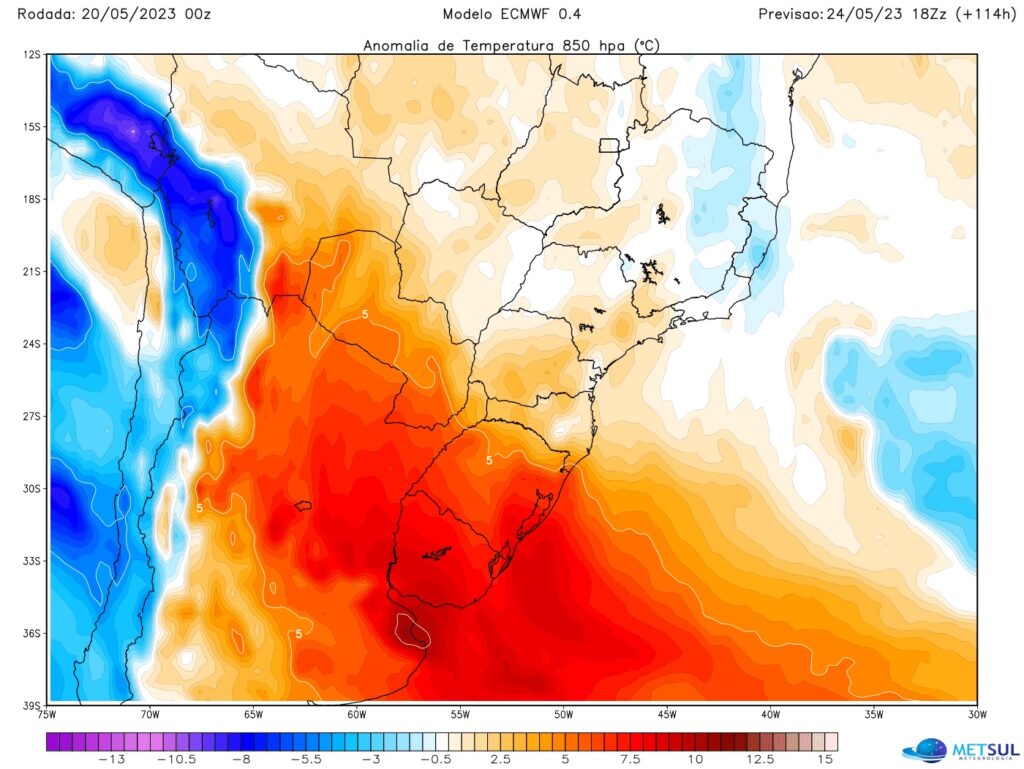 Este sábado, ainda teve o domínio de ar muito seco, teve mais uma madrugada com mínima que caiu abaixo de zero no estado gaúcho com 1,7ºC negativo em São José dos Ausentes. Nos próximos dias, entretanto, a tendência é de elevação das mínimas e principalmente das máximas no Rio Grande do Sul. Isso porque uma grande massa de ar quente vai se instalar durante a próxima semana sobre as latitudes médias da América do Sul com temperaturas elevadas para esta época do ano no Sul do Brasil, Paraguai, Uruguai e no Centro da Argentina.